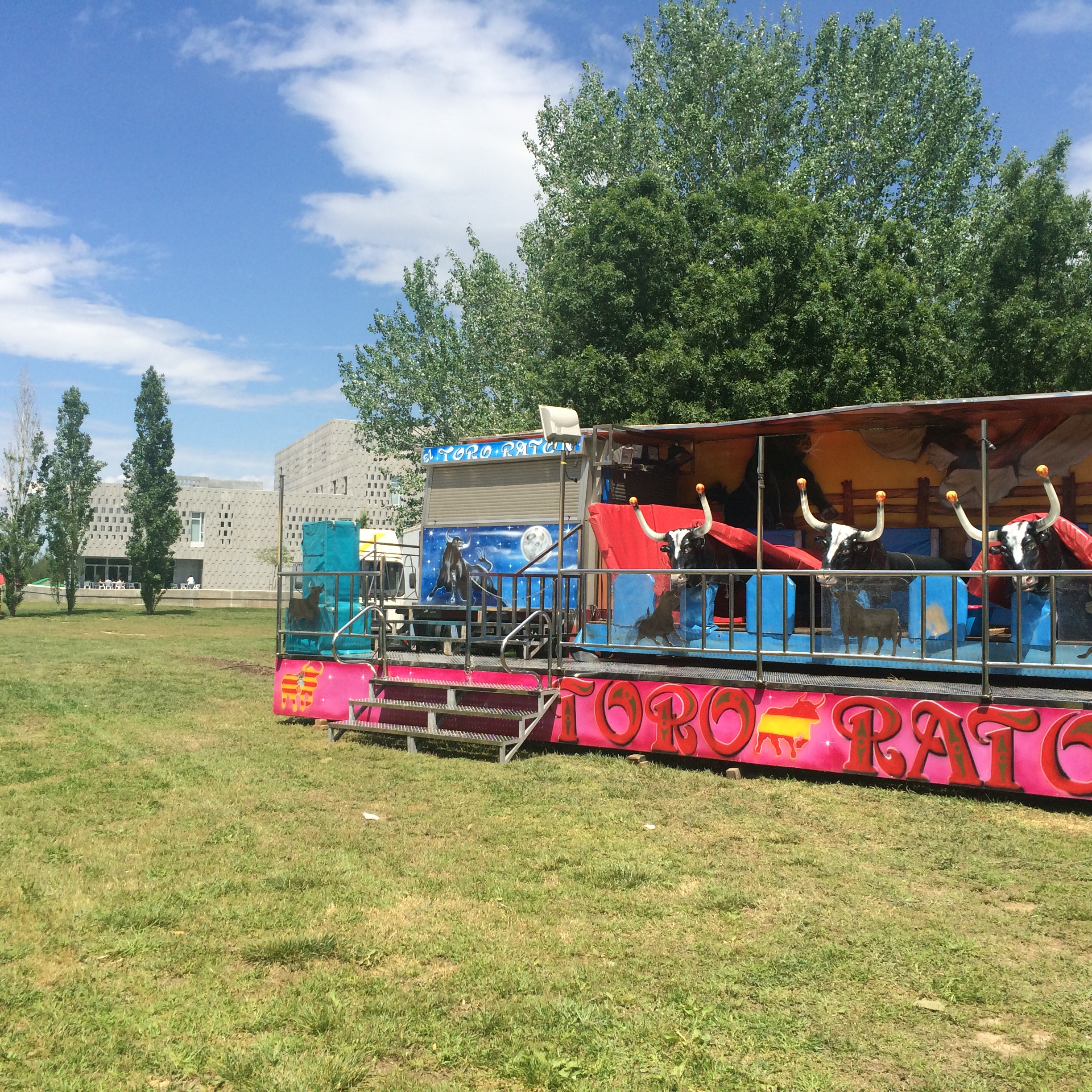 Background: my workplace. Foreground: the makings of a fair! The Ebre Fira is this weekend, and the grounds around campus are filled with carnival rides and game. In this one, I think kids can try their hands/bottoms at bull-riding.