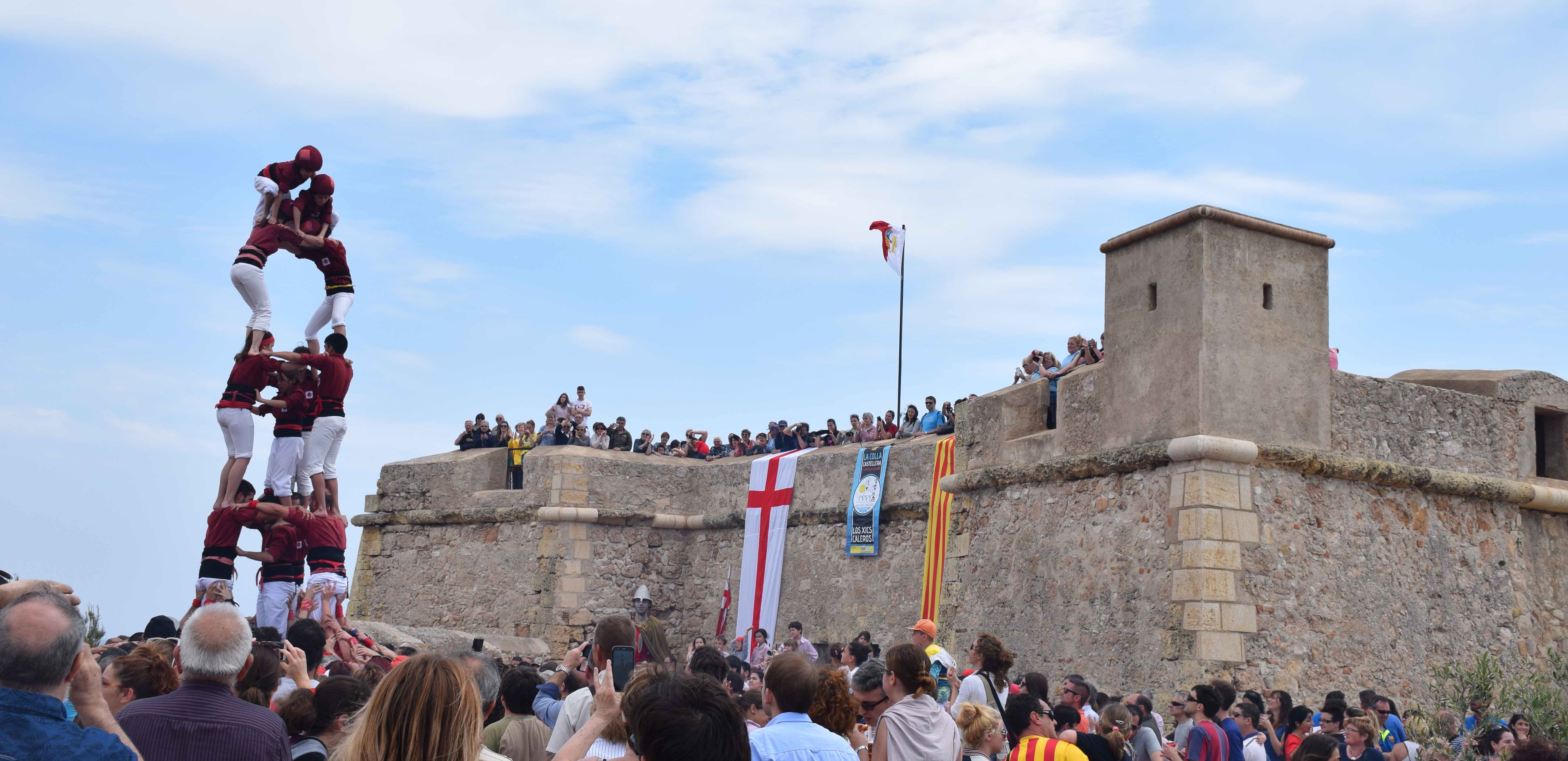A castell in front of a castello in l’Ametlla del Mar, as part of a Sant Jordi fiesta last weekend. Not captured in this photograph: the beach in the background, the gralla band playing music to build the tension as the castellers build their castell;  a BBQ area where fresh sardines were being cooked for breakfast! 1€ for a plate of salty, delicious fish, and a swing of wine.