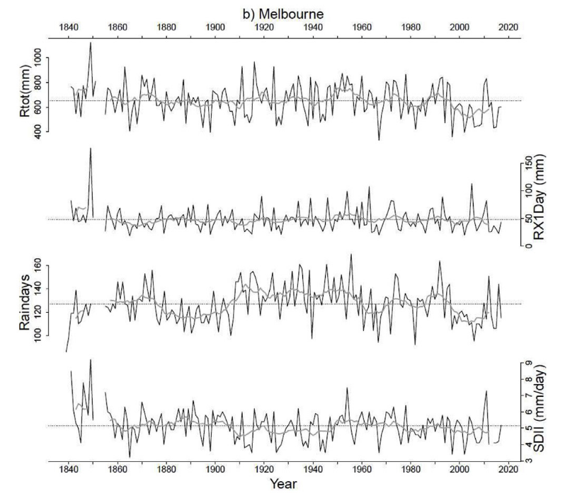 The recent Millennium Drought, for example, stands out in the extended Melbourne record as a clear period of low rainfall due to a drop in the number of rain days.